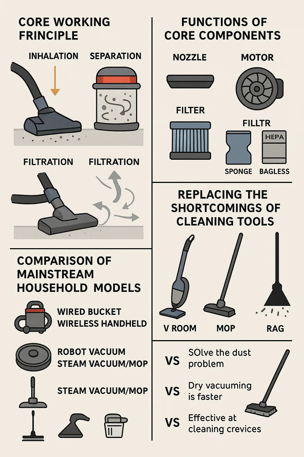 Opérations clés: ▶ Inhalation - Le moteur tourne, créant une zone à basse pression. L'air, transportant de la poussière, se précipite dans la buse d'aspiration; ▶ Séparation - Le mélange de poussière tourbillonne dans le bac à poussière, ce qui fait tomber les particules lourdes dans la boîte de collecte de poussière; ▶ Filtration - La poussière fine est piégée par le filtre et l'air propre est déchargé par l'arrière.
