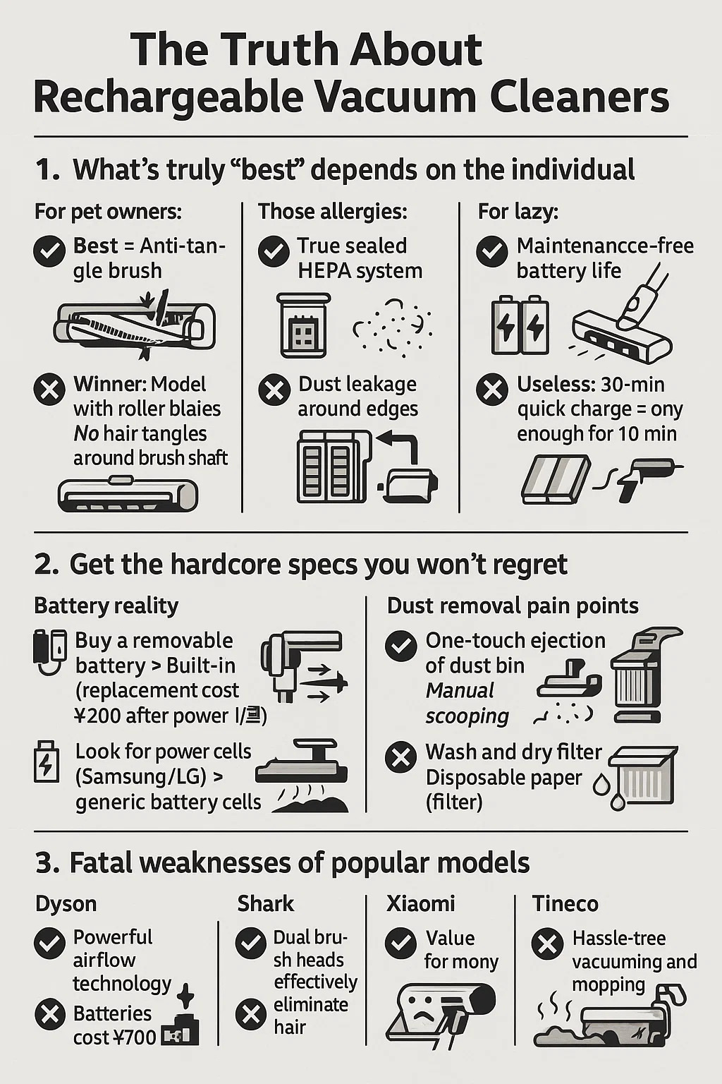 Pour les propriétaires d'animaux : « Meilleur » = Brosse anti-enchevêtrement Aucun poil ne s'emmêle autour de la tige de la brosse. Gagnant : Modèle à rollers (aspire et coupe simultanément, éliminant le démontage). Gimmick : puissance d'aspiration de 200AW, mais la brosse à rouleau nécessite une demi-heure d'épilation manuelle.